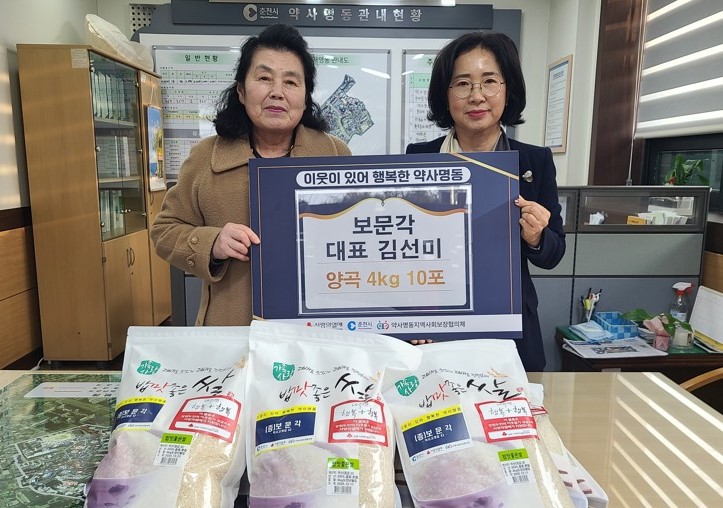 보문각 양곡 기부 춘천뉴스 (112.♡.64.42) 0 01.27 보문각(대표 김선미)은 지난 26일 동네 취약계층을 위한 양곡 4kg 10포를 약사명동지역사회보장협의체에 전달했다.이상호