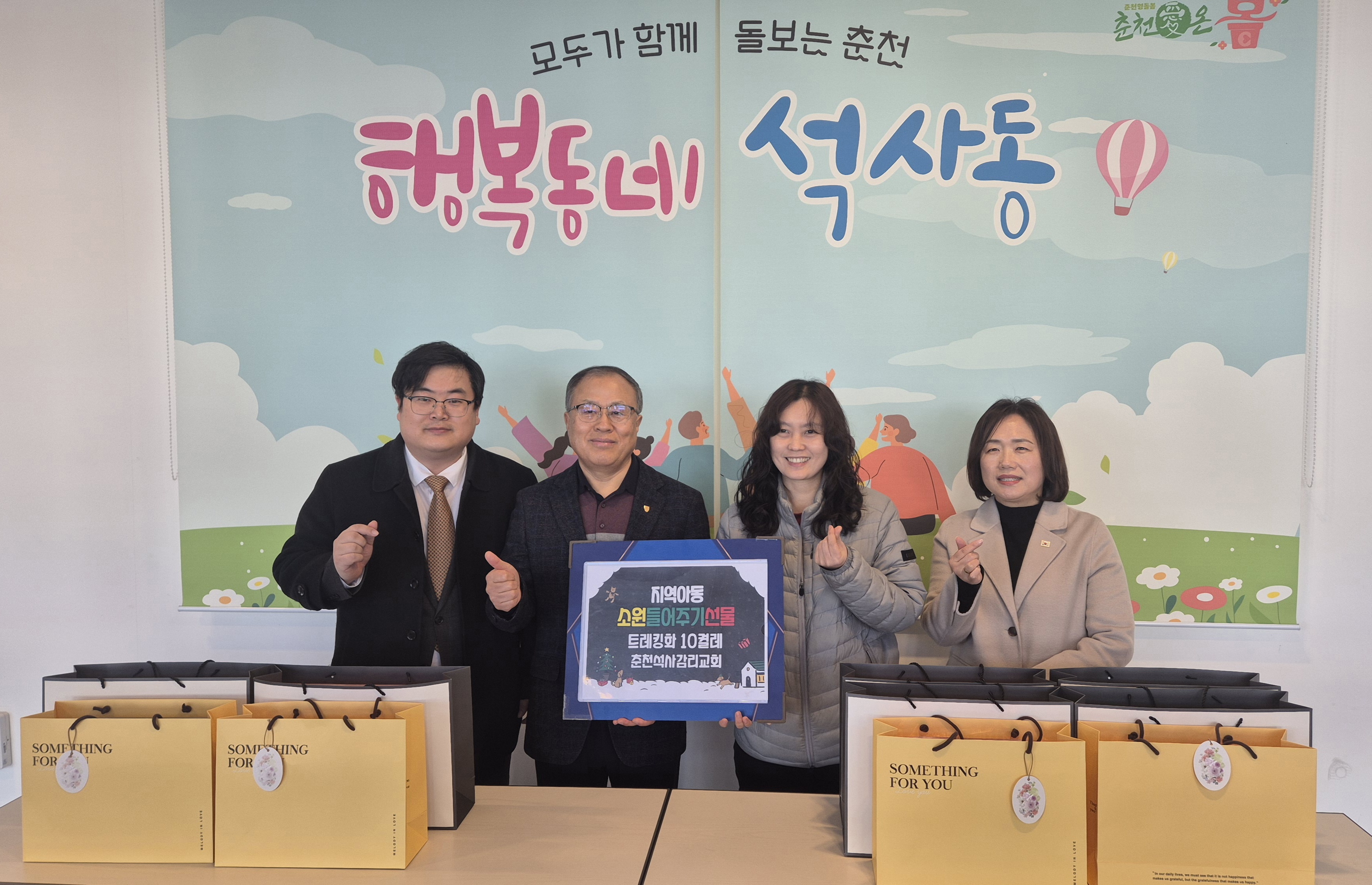 춘천석사감리교회 트레킹화 10켤레 전달 춘천뉴스 (222.♡.198.66) 0 01.29 춘천석사감리교회(담임복사 손학균)는 29일 석사동행정복지센터(동장 조영주)를 방문해 춘천반석지역아동센터(센터장 박성희)에 지역사회 아동을 위한 트레킹화 10켤레를 전달했다. 이번 후원은 춘천석사감리교회가 석사동 지역사회 어린이의 꿈과 희망을 지원하기 위해 마련됐다. 손학균 담당목사는 “작은 후원이지만 지역사회 아동들의 밝은 미래를 응원한다”고 밝혔다.이상호