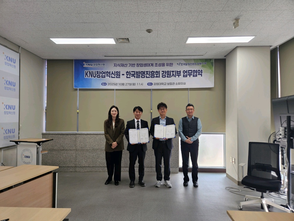 강원대학교(총장 정재연) KNU창업혁신원(원장 최용석)이 10월 27일(월) 춘천캠퍼스 보듬관 소회의실에서 한국발명진흥회 강원지부(지부장 최동호)와 「공동 발전 및 창업지원사업 연계 활성화를 위한 업무 협약」을 체결했다.