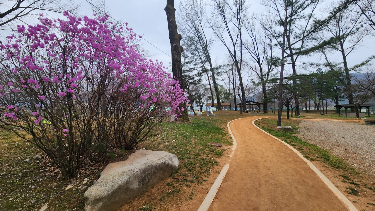 △ 화천 붕어섬 맨발길 옆으로 활짝 핀 진달래