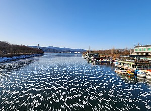 △ 춘천공지천 위에 쌓인 하얀 눈일요일인 1월 25일 춘천의 대표적 명소 중 하나인 공지천이 겨울 한파에 꽁꽁 얼어붙으면서 하얀 눈이 쌓여 새로운 볼거리를 주고 있다.이상호